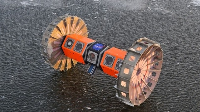The robot, designed for a future Europa mission, is a buoyant rover with two independent wheels to maneuver along the under-side of the ice. Engineer from the NASA Jet Propulsion Laboratory, Dr Andy Klesh, said the meter-long rover will be able to roam around taking samples and pictures.
