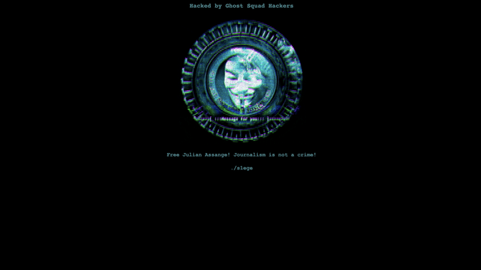 The Idaho State Parks and Recreation, STEM Action Center and personal protective equipment supply site homepages each displayed the same content: a black background with the text "Hacked by Ghost Squad Hackers" displayed in blue text. "Free Julian Assange! Journalism is not a crime!" reads a message displayed underneath a GIF of V, the Guy Fawkes mask-wearing vigilante from the 2005 film "V for Vendetta."