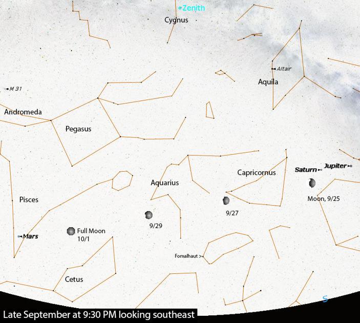 Mars is now visible earlier in the evening, first appearing at about 8:45 p.m. on the eastern edge of the dim constellation Pisces. Almost straight above Mars and Pisces will be the Great Square of Pegasus. To the left of Pegasus is Andromeda with the closest large galaxy to us, the Andromeda Galaxy (aka M31), just above the middle stars of Andromeda.