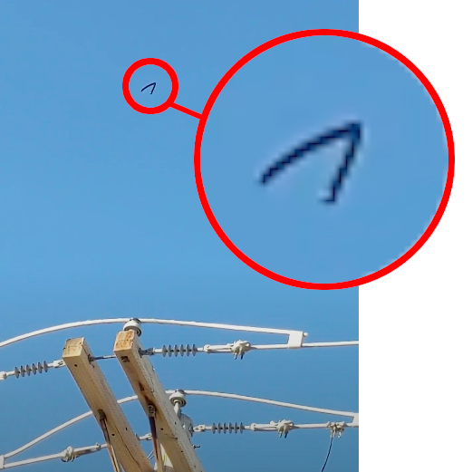 A screenshot from Amanda Luzzader's video shows an enlarged view of a shiny, tubular, black v-shaped object flying over Smithfield on Tuesday.