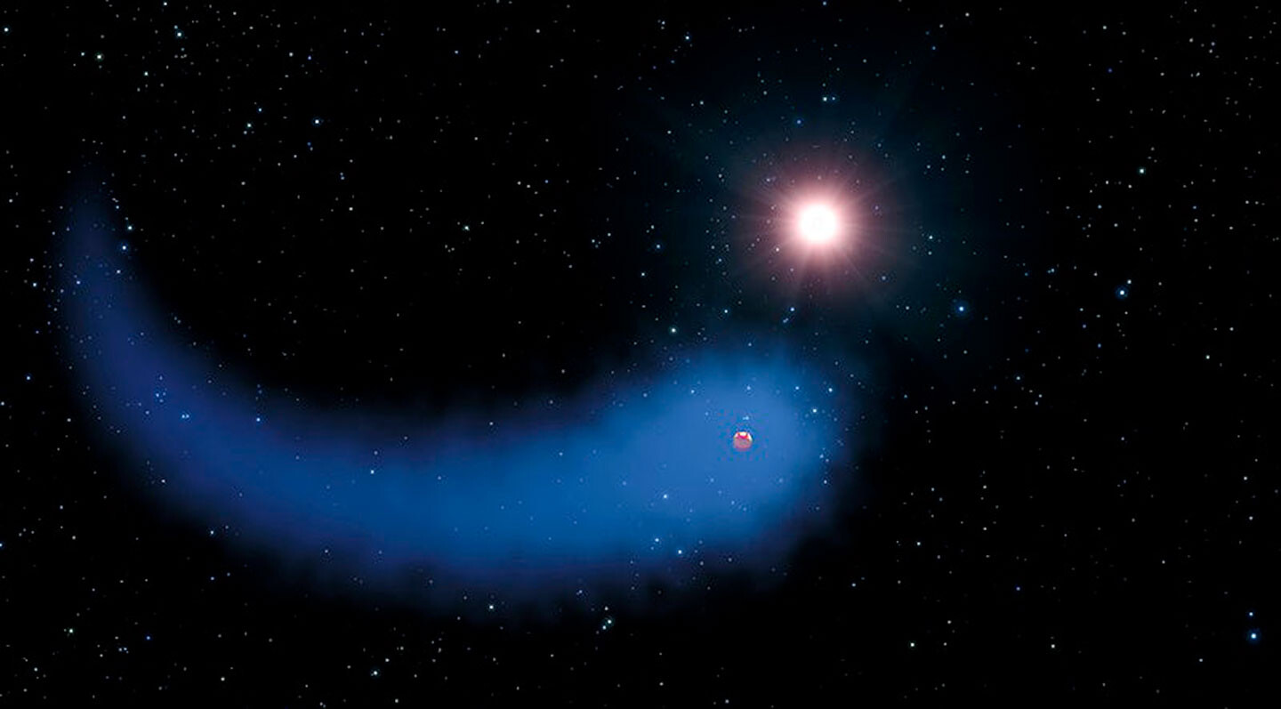 An artist's rendition of "The Behemoth," an enormous comet-like cloud of hydrogen bleeding off of a warm, Neptune-sized planet. Also depicted is the parent star, which is a faint red dwarf named GJ 436. Image credit: NASA, ESA, and G. Bacon (STScI).