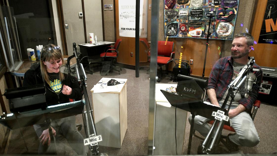 Rosie Seitz Ayers records voice parts for a short play as Michael Legg, the artistic director of the Montana Repertory Theatre, listens nearby in a studio at the University of Montana in February. The Rep is producing plays that can be accessed through smartphones.