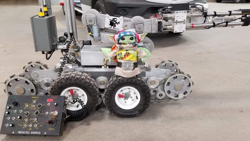 On April 24, Baby Yoda went on a tour of fire departments around central Iowa, starting with the State Fire Marshal Division. Staff took pictures with the toy showing off their facilities and gave it a ride on a bomb robot, a machine with a controllable arm and thermal imaging used to locate and safely defuse explosives.