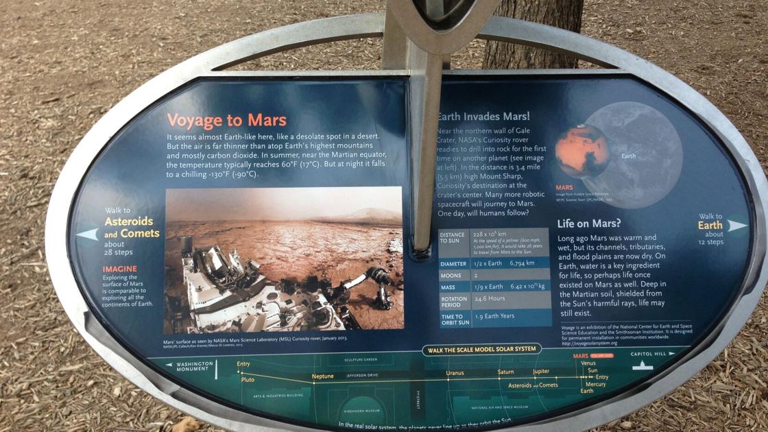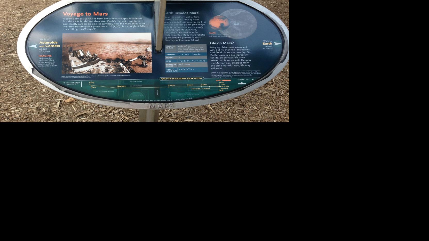 This image shows an informational sign on the National Mall in Washington, D.C., that is part of a 1-to-10-billion scale of the solar system created by the National Center for Earth and Space Science Education's Voyage National Program.