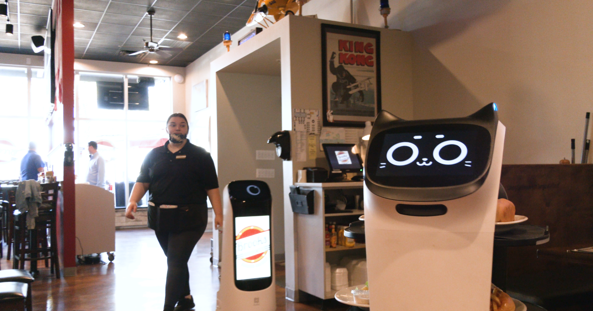 Robots on wheels help servers bring food to the tables, providing servers more time to attend directly to customers. Brooks said that servers are able to give better service to customers, as well as up-sell desserts and drinks.