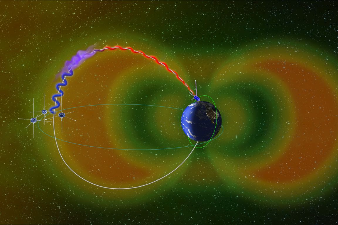 Electrons in a Van Allen radiation belt (blue) encounter whistler waves (purple) and are sent raining toward the north pole (red). THEMIS satellites are seen near the radiation belt, while UCLA's ELFIN hovers above Earth.