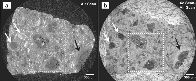 ( a ) XCT slice 316 (magnified by 2x) of Air scan showing an isolated pore (the largest of 5 visible in this crystal) in an Fe-bearing olivine chondrule that has not been infiltrated with xenon ( b ).