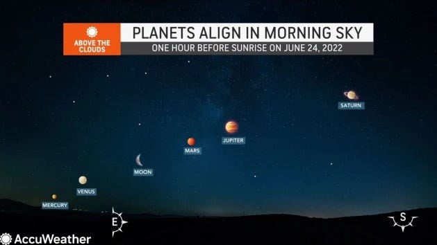 For the first time since 2004, five planets will create a straight line across the night sky in late June. This rar… https://t.co/p1EMi78F7T accuweather (from State College, PA) Sat Jun 18 06:29:06 +0000 2022