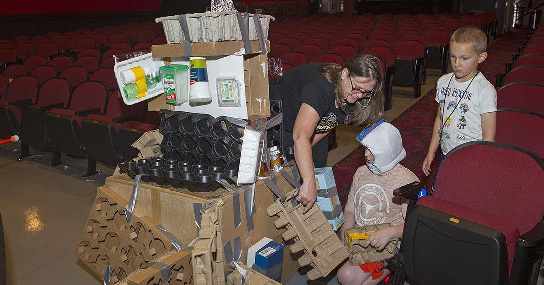 Risa Miller, left, helps JT, center, build his Mars habitat as Mason watches during Janet's Planet Astronaut Academy Wednesday, June 22, 2022 at the Brauntex Theatre in New Braunfels.