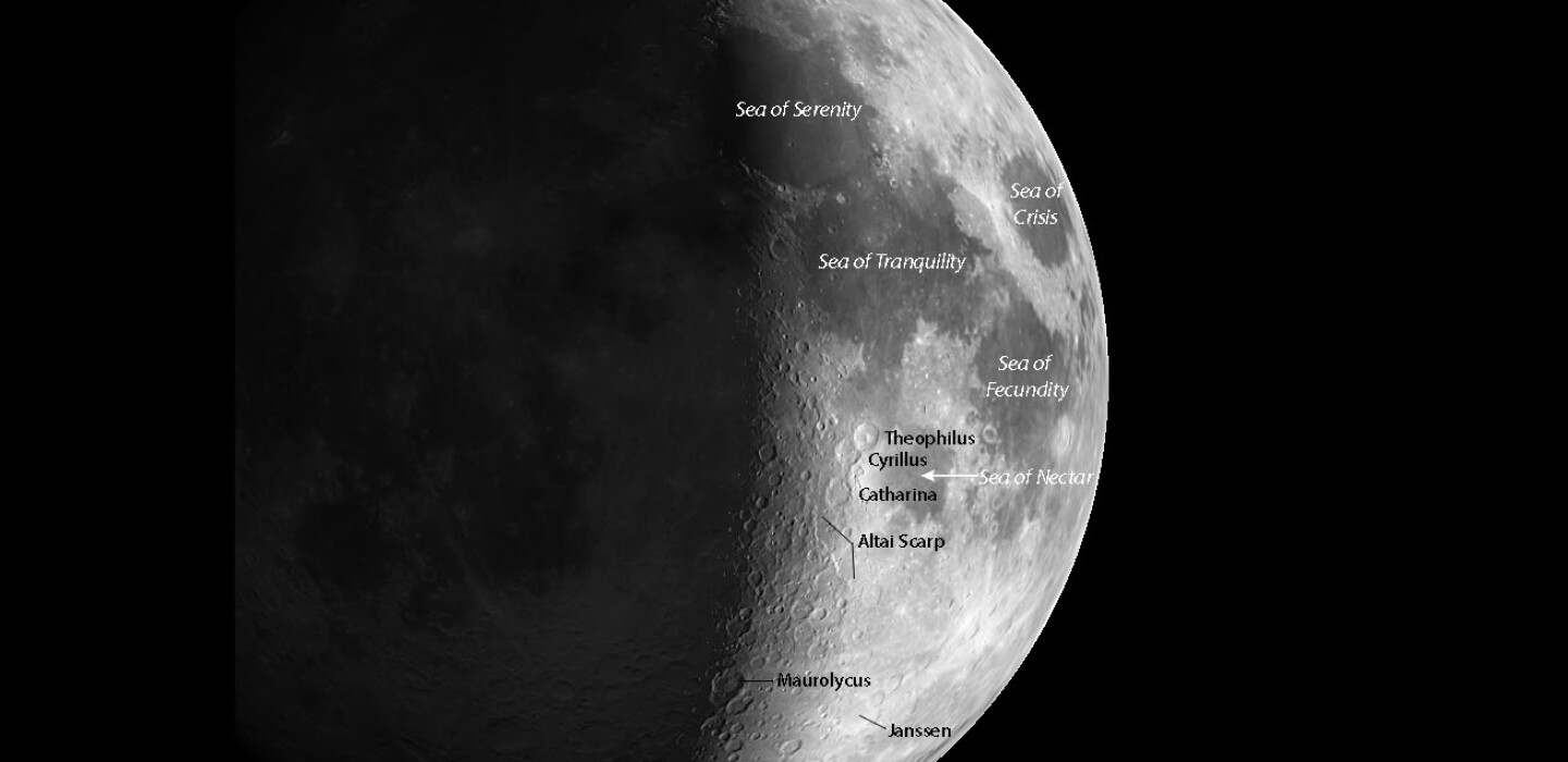 The moon is a wonderful place to visit with a pair of binoculars or a small telescope. As it approaches half or first-quarter phase, thousands of craters come into view, several of which are highlighted on the map above.