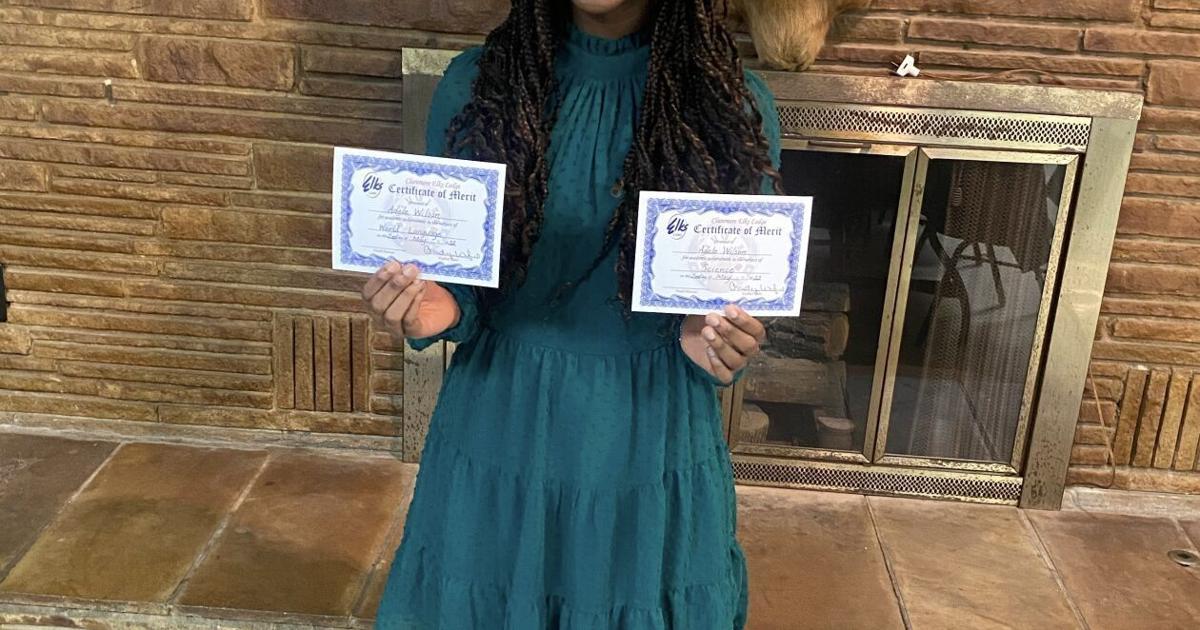 Adele Wilson holds two Certificates of Merit for academic achievement in the subjects of World Language and Science from the Claremore Elks Lodge.