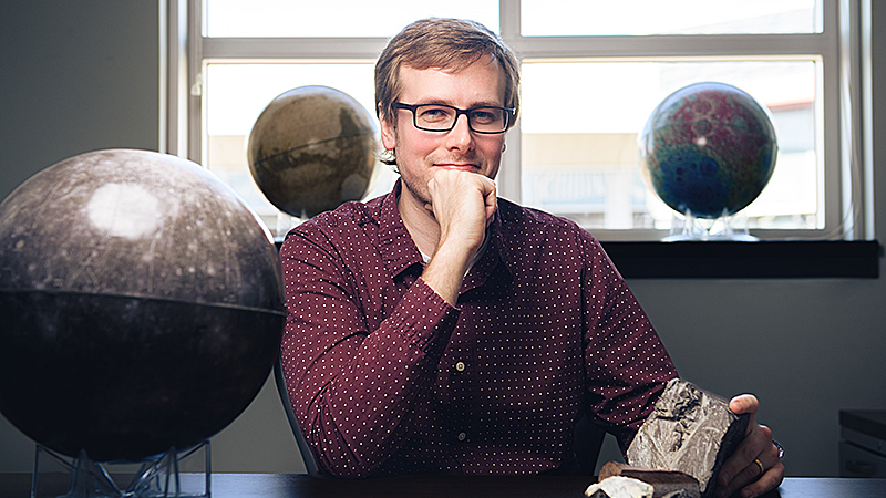 Brandon Johnson, an expert in impact crater dynamics, surrounded by some of his favorite research subjects: Mercury, Mars and the moon. (Purdue University photo/Rebecca McElhoe)
