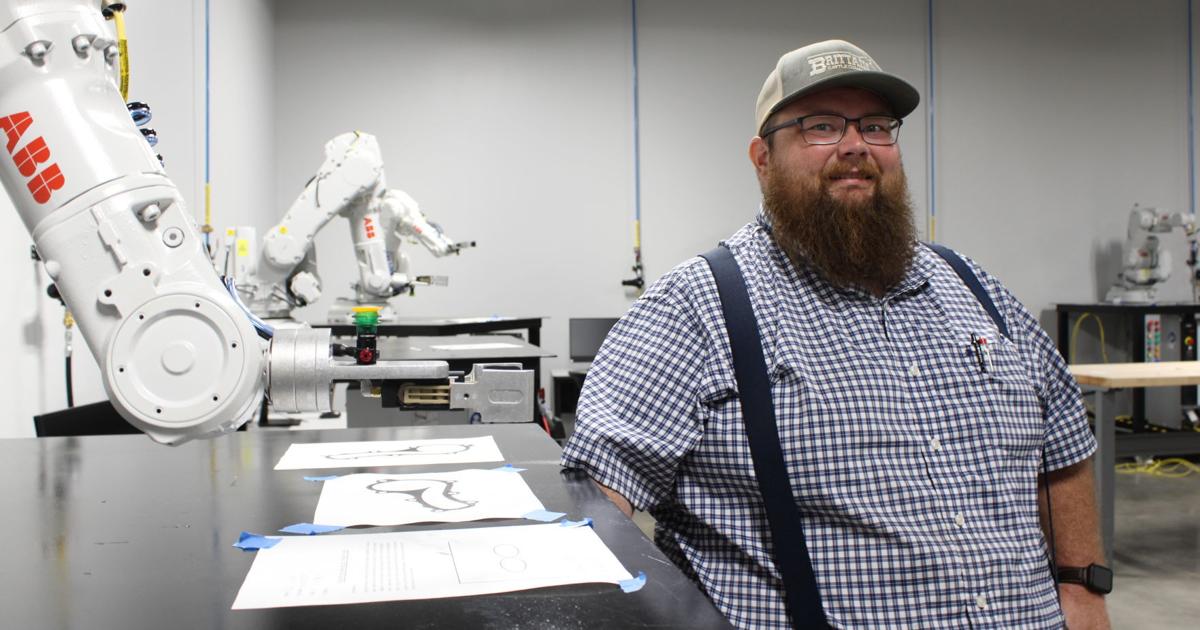 Sam George, mechatronics program director at Piedmont Technical College, poses for a photo next to an ABB robot.