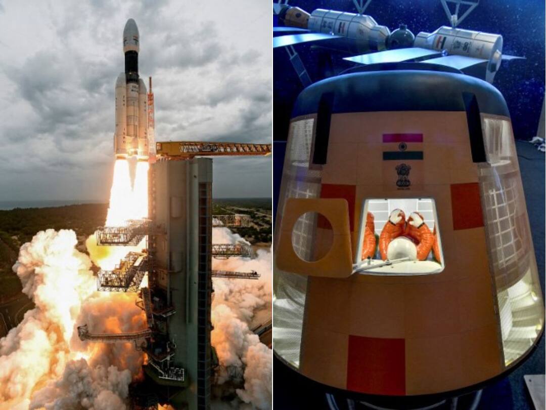 (Left) The Indian Space Research Organisation's (ISRO's) Chandrayaan-2 was launched aboard the Geosynchronous Satellite Launch Vehicle Mark III (GSLV Mk III-M1) on July 22, 2019; (Right) Dummies of astronauts inside a model of Gaganyaan's orbital module ( Image Source : AFP )