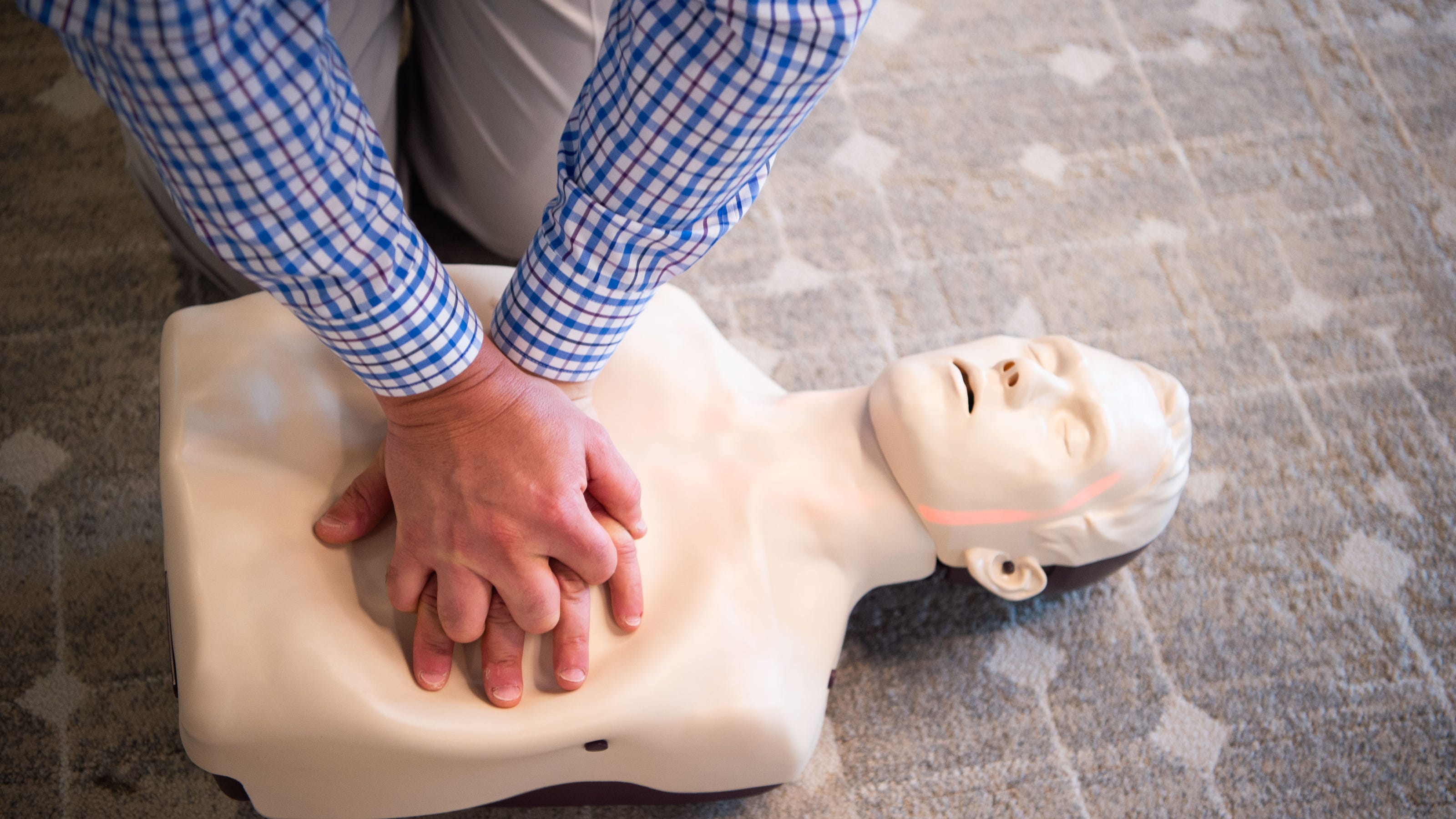 "I'm doing 30 compressions," said John Dymond, HealthStream's associate vice president. He pressed deeply on the mannequin's torso watching real-time feedback on a tablet. "You do not have to have an instructor standing over you. The iPad application serves as the instructor."