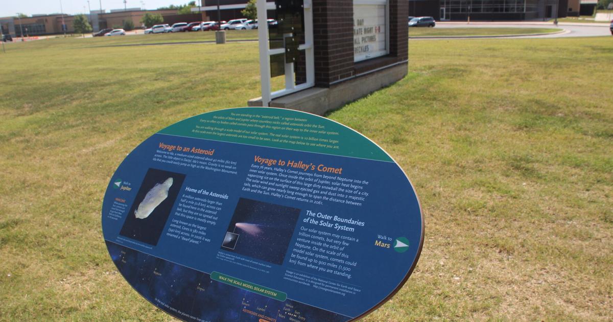 A marker outside Creekwood Elementary School in Broken Arrow denotes where the asteroid belt would be in a 1-to-10 billion scale model of the solar system. Organizers and municipal leaders officially cut the ribbons on the 2,000-foot-long model Tuesday afternoon.