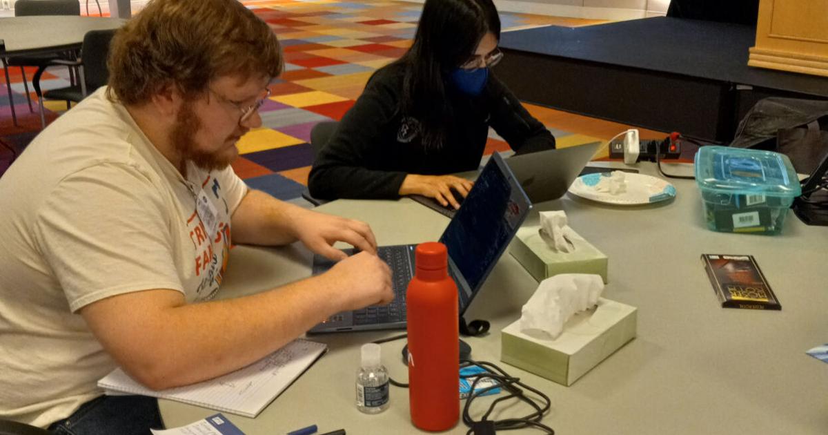 Trine University student Sean Davis, left, works on the "Geyser of Galaxies" project during the NASA International Space Apps Challenge, held Oct. 1-2 in Cleveland.
