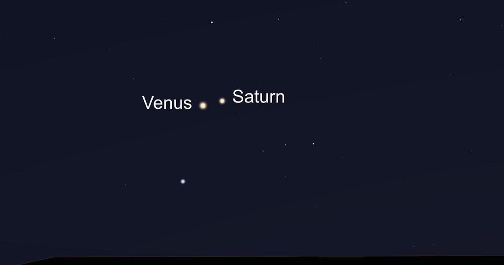The new year opens with Venus climbing out of the sun's afterglow. On Sunday, Jan. 22, Saturn drops past Venus as Earth's orbital motion sends the ringed planet tumbling into the sunset.