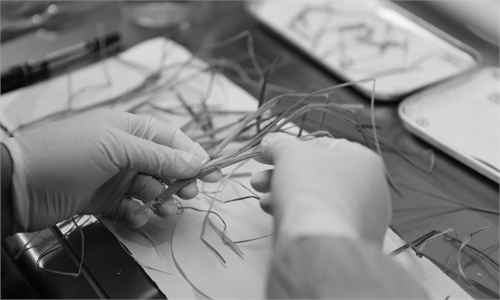 Researchers study the world's first rice seedlings harvested in space that arrived with Shenzhou-14 crew's return capsule on December 4, 2022. Photo: The Chinese Academy of Sciences