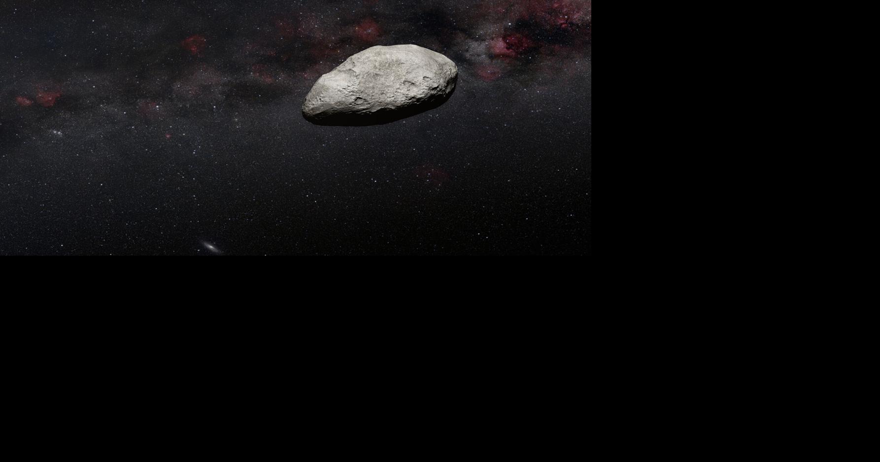An artist's illustration depicts an irregularly shaped gray asteroid similar to the new object spotted by the Webb telescope.
