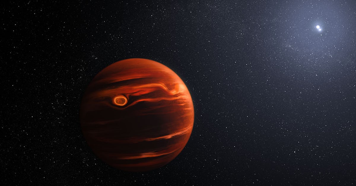 This illustration conceptualizes the swirling clouds in the atmosphere of exoplanet VHS 1256 b identified by the James Webb Space Telescope. The planet is about 40 light-years away and orbits two stars locked in their own tight orbit.