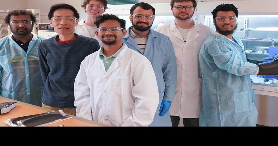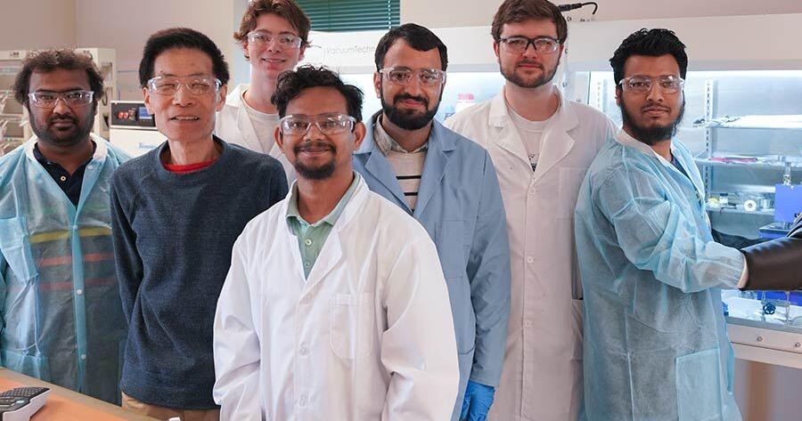 Dr. Weibing Xing, (second from left) and his research team (from left to right: Gulam Smdani, Weibing Xing, Haiden Studer, Wahid Hasan, Amir Razzaq, Chris Poches and Salman Khan Mithil) in a next-generation battery research laboratory at South Dakota Mines.