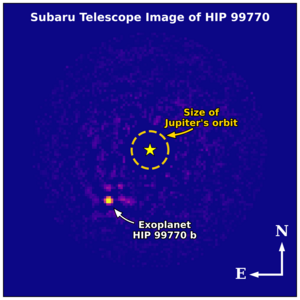 image: Infrared image of HIP 99770 taken by the Subaru Telescope. The bright main star at the position marked with * is hidden. The dashed ellipse shows the size of Jupiter's orbit around the Sun for scale. The arrow points to the discovered exoplanet HIP 99770 b. view more