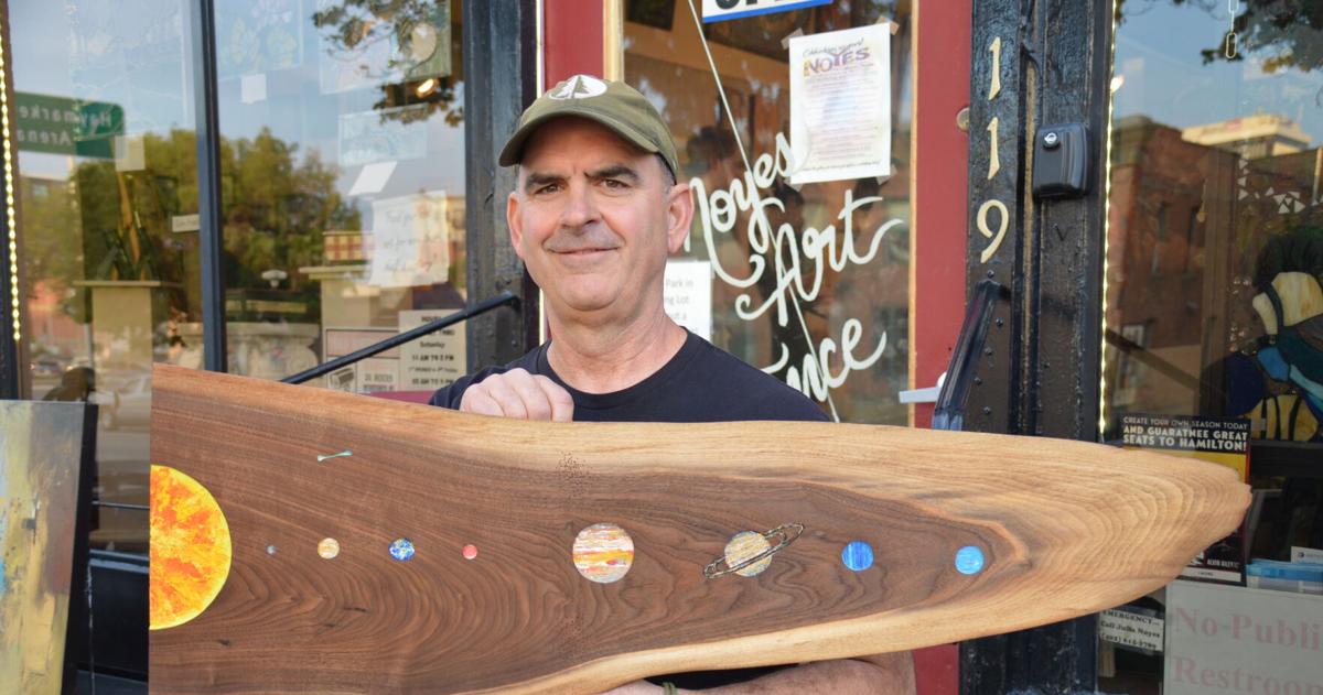 Rick Clark with the solar system art he created on a black walnut plank, which caught the eye of NASA planetary scientist Hal Levison while he was in Lincoln.